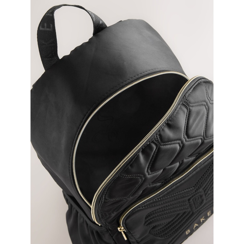 Send her back to school in chic style with the Baker by Ted Baker Girls Back To School Black Quilted Bow Backpack with Pencil Case. This sophisticated backpack boasts a luxurious black satin upper with a stylish quilted design, elevated by a charming bow detail on the front pocket. Practicality meets elegance with a spacious front pocket for easy access essentials and two side pockets, perfect for carrying water bottles. Adorned with subtle gold Baker branding, adjustable straps for a comfortable fit, and Baker branded trims and lining, this backpack is designed to make a statement. Complete the look with the matching lunch bag, also available. Quilted Front pocket Adjustable straps Perfect for school Height 38cm Width 25cm Depth 12cm 2 x Bag Shell 98% Polyester, 2% Elastane. Lining 100% Polyester.