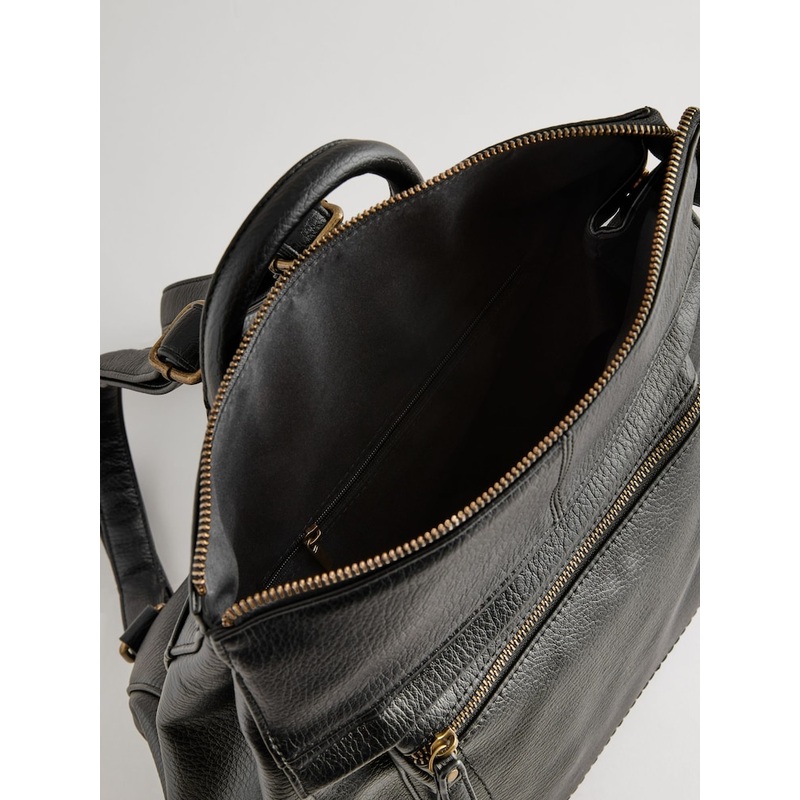 In a vintage-inspired messenger style, this stylish black backpack is made from a soft faux leather with a zippered front pocket, a main pocket and an internal zippered compartment for your valuables, finished with a carrying handle and two adjustable shoulder straps. Faux leather Zippered front pocket Zippered main compartment Carrying handle Adjustable straps Height 36cm Width 30cm Depth 11cm Main 100% PU. Lining 100% Recycled polyester.