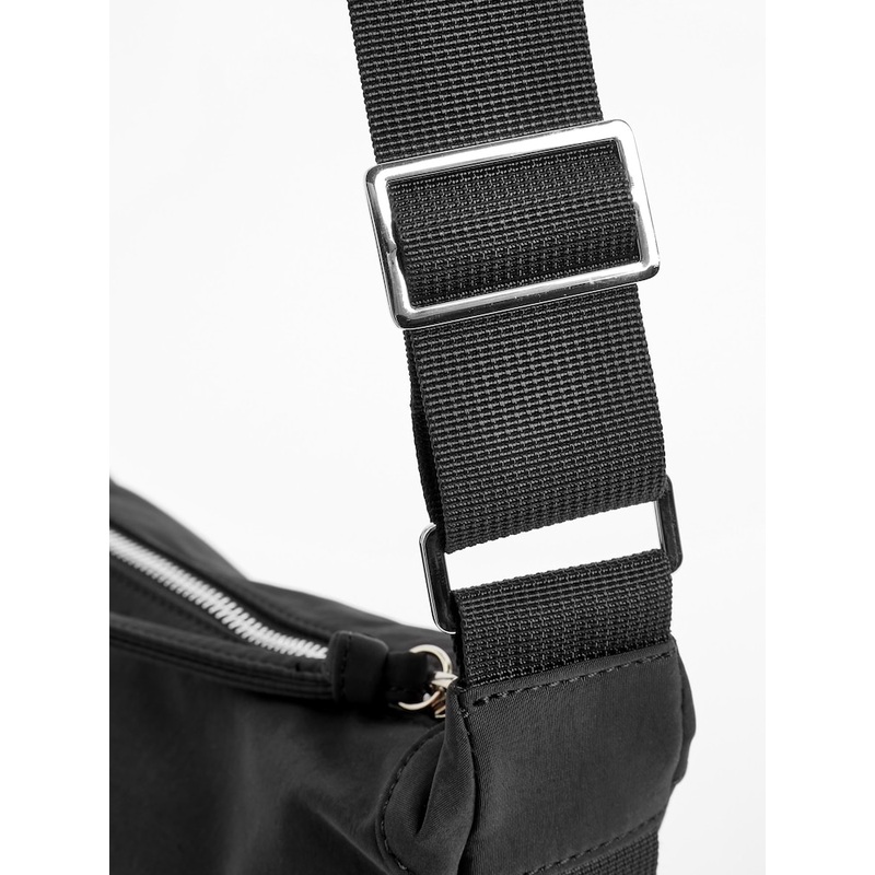 This black sling bag is perfect for carrying your small daily essentials, with a raffia design that brings the holiday vibe from the airport to the beach bar. The bag has an adjustable shoulder strap with a zippered main pocket. Sling bag Raffia design Adjustable shoulder strap Zippered main compartment Height 15.5cm Width 30cm Depth 9.5cm Main 100% Polyester. Lining 100% Recycled polyester.