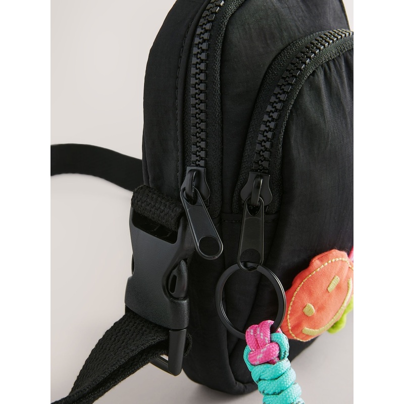 This black cross-body bag is a handy way to house your essentials on the go, with a utility-inspired design, colourful patches, dual zippered fastenings, a key chain and and adjustable shoulder strap. Durable nylon fabric Dual zippered pockets Key chain Adjustable shoulder strap Height 17cm Width 11cm Depth 3cm Main 100% Nylon. Lining 100% Polyester.