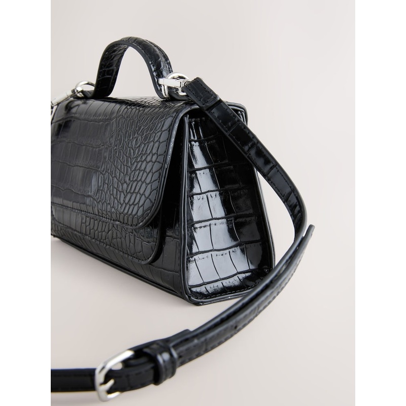 Made from a soft and smooth faux leather, this hand held bag has a carrying handle to the top and an adjustable, removable strap. A magnetic fastening to the flap closure keeps your essentials safe, with a zippered internal compartment residing inside. Faux leather Carrying handle Adjustable and removable strap Flap closure Internal pocket Height 13cm Width 23cm Depth 5cm Outer 100% Polyester with PU coating. Lining 100% Recycled polyester.
