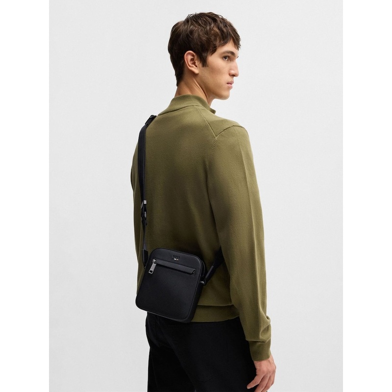 A reporter-style bag in synthetic coated fabric with a grained structure by BOSS Menswear. This accessory features signature details including embossed branding. Synthetic coated fabric, sometimes referred to as faux leather, is a fabric designed to resemble real leather, and/or display a matte, glossy, smooth, or textured, coated appearance. Measurements: 16 x 18 x 6cm. 70% Polyurethane, 30% Polyester.
