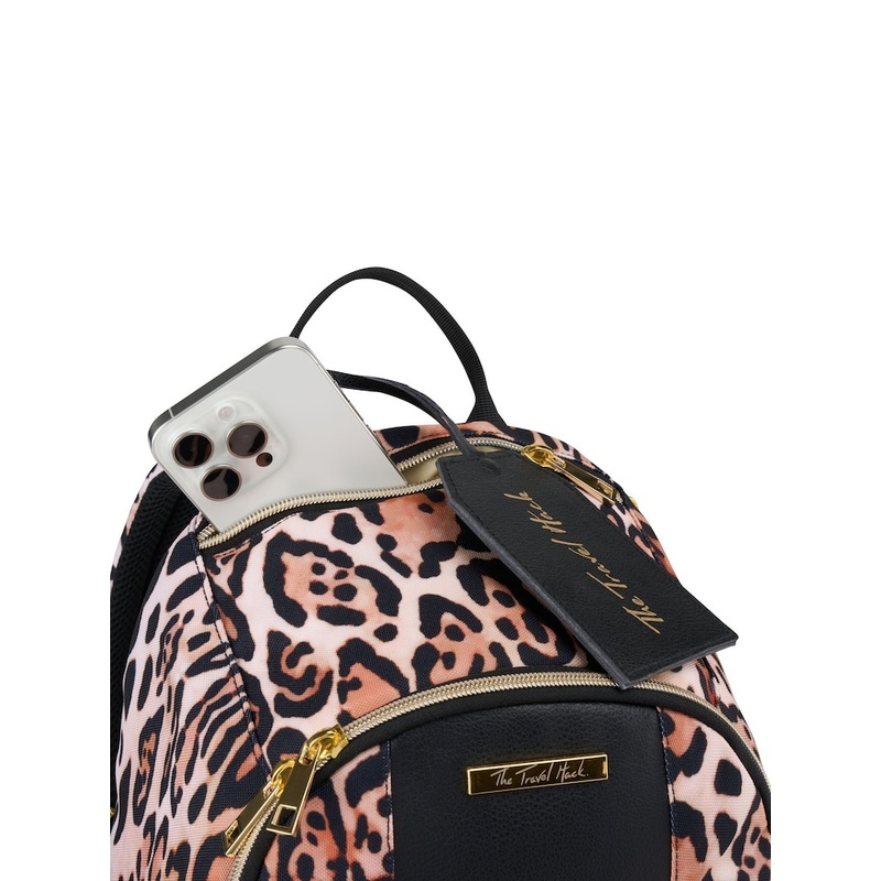 A stylish, compact ladies travel backpack in black/grey. Padded back laptop or ipad pocket compatible for devices up to 13. Fits Ryanair Cabin Bags 40x20x25cm free under-seat hand luggage rules. Flies for free on all known airlines. Lightweight design weighs just 0.6kg Features an easy access top pocket for purses, sun glasses, phones and travel documents. 20L internal capacity Comfortable padded airmesh back panel and straps Showerproof external shell with rose gold coloured detailing, ID holder, 3D packing pockets Water bottle holder and strap on the rear panel to combine effortlessly with rolling luggage Height 40cm Width 25cm Depth 20cm 100% Polyester.