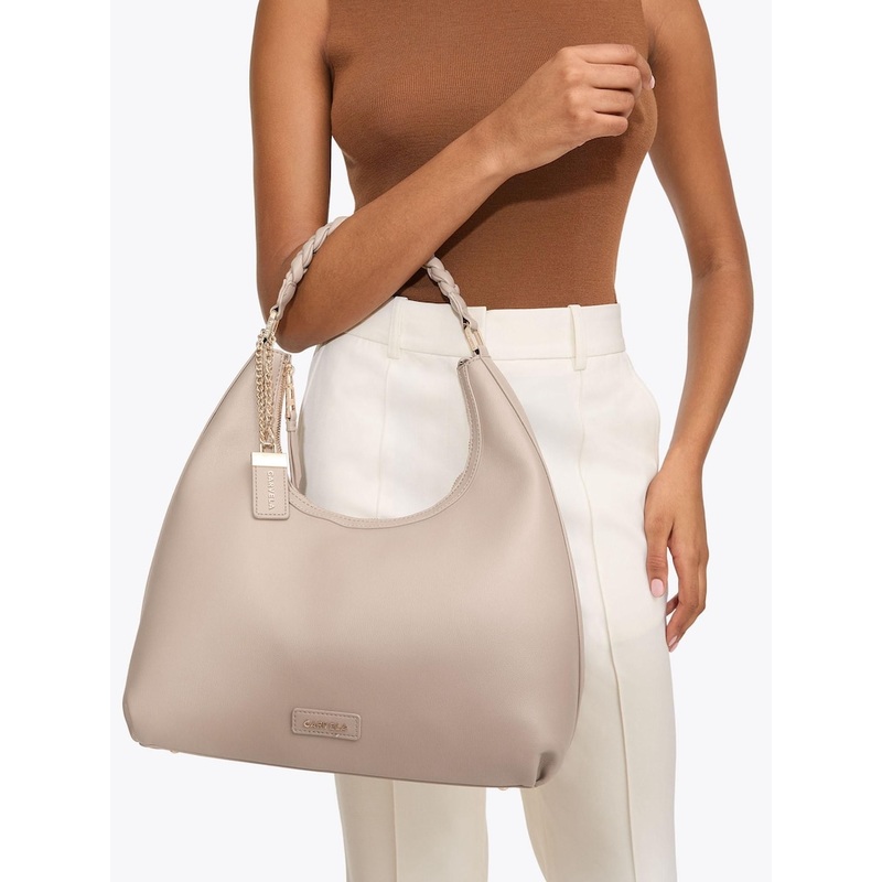 This Carvela Alessia Plait Tote Bag fits over the shoulder with a black plaited strap. The moon shaped bag features gold tone branding details as well as a branded tag around the strap. Dimensions: 24cm (H), 37cm (L), 14cm (D). Strap length: 35cm. 100% Syn