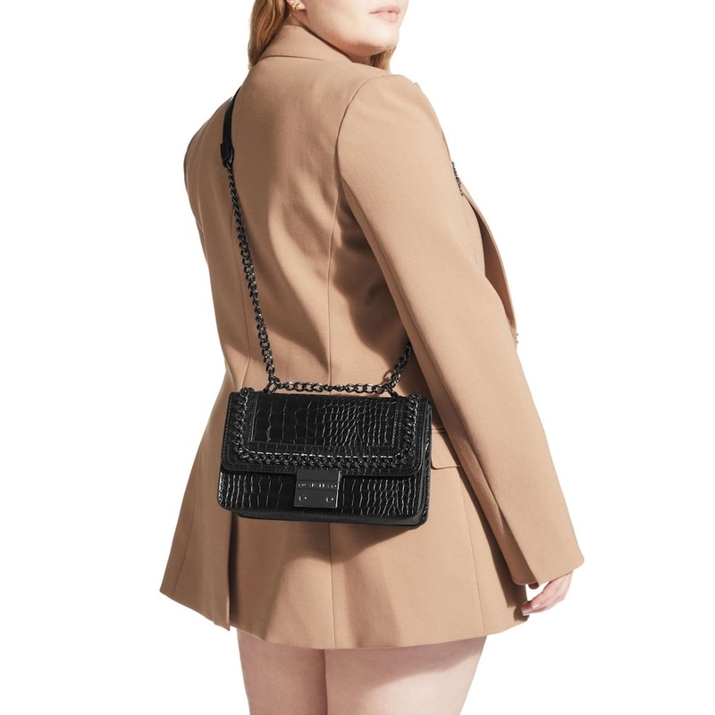 The Bailey Quilted Chain Shoulder Bag features a croc-embossed exterior in black. The front flap is embellished with gunmetal chain and the bag is closed with a gunmetal branded plate. 15cm (H), 28cm (L), 8cm (D). Magnetic snap closure. Can fit phones up to 7 inches. Height 28cm Width 15cm Depth 8cm 100% Polyester.