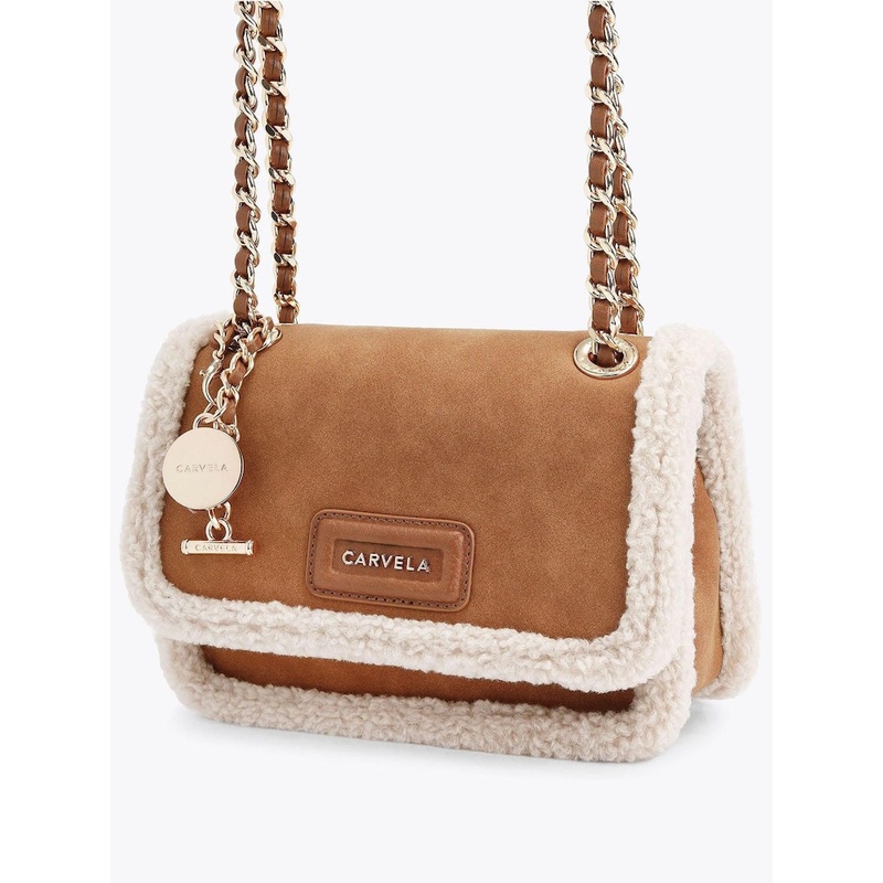 This Carvela Bella Chain Shoulder Natural bag is crafted from a black tweed fabric which is trimmed with black faux fur. There is an optional gunmetal chain wrap charm detail to sit on the front flap. Dimensions: 16cm (H), 20cm (L), 8cm (D) Strap length: 66cm 100% Polyester.