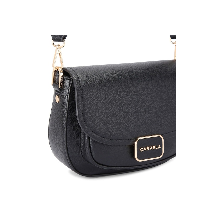 This Boxy Saddle Bag is crafted from a textured black leather alternative. The curved front flap is adorned with a gold trimmed branded plate. 17cm (H), 22cm (L), 5.5cm (D). 100% Synthetic rubber.