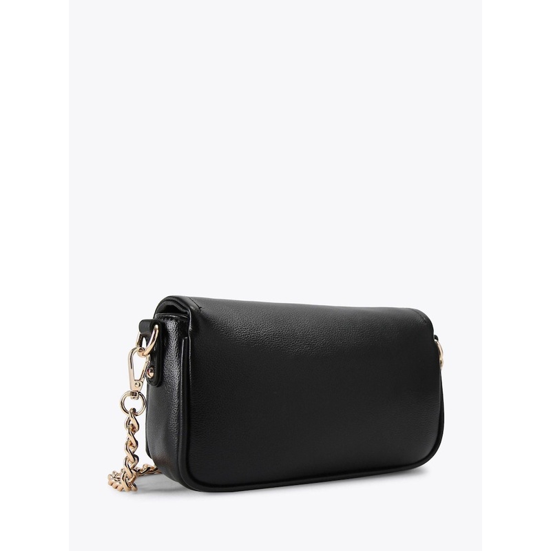 This Carvela Como Chain Shoulder Bag features a textured black exterior with gold tone branding on the front flap. There are two removable straps for optional styling. Dimensions: 12cm (H), 21cm (L), 6cm (D). Strap length: 122cm. 100% Synthetic rubber.