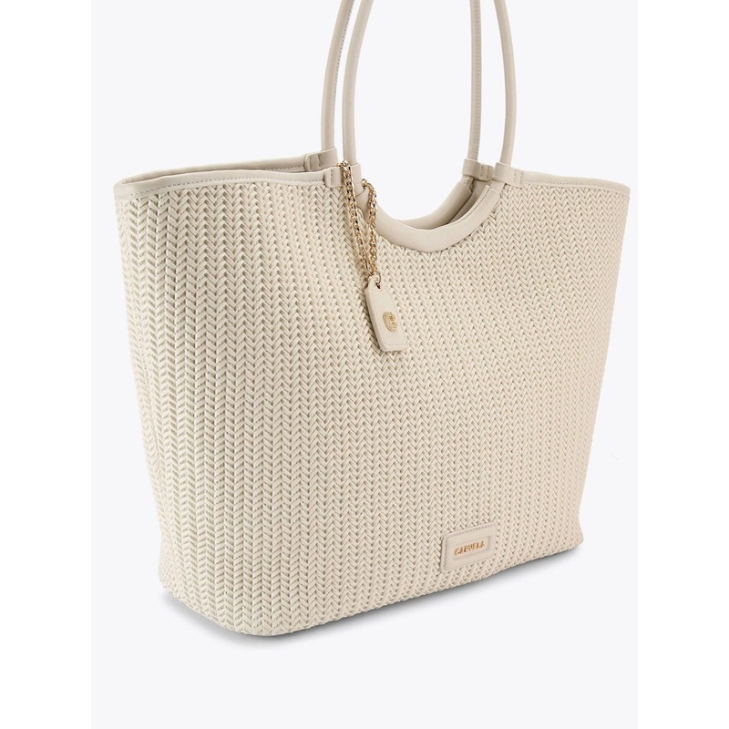 This Carvela Sardinia Woven Tote Bag features a bone woven fabric exterior with soft structure. There are two large rounded top handles to sit on the shoulder. There is a gold branded tab which can be removed on the top handles. Dimensions: 30cm (H), 40cm