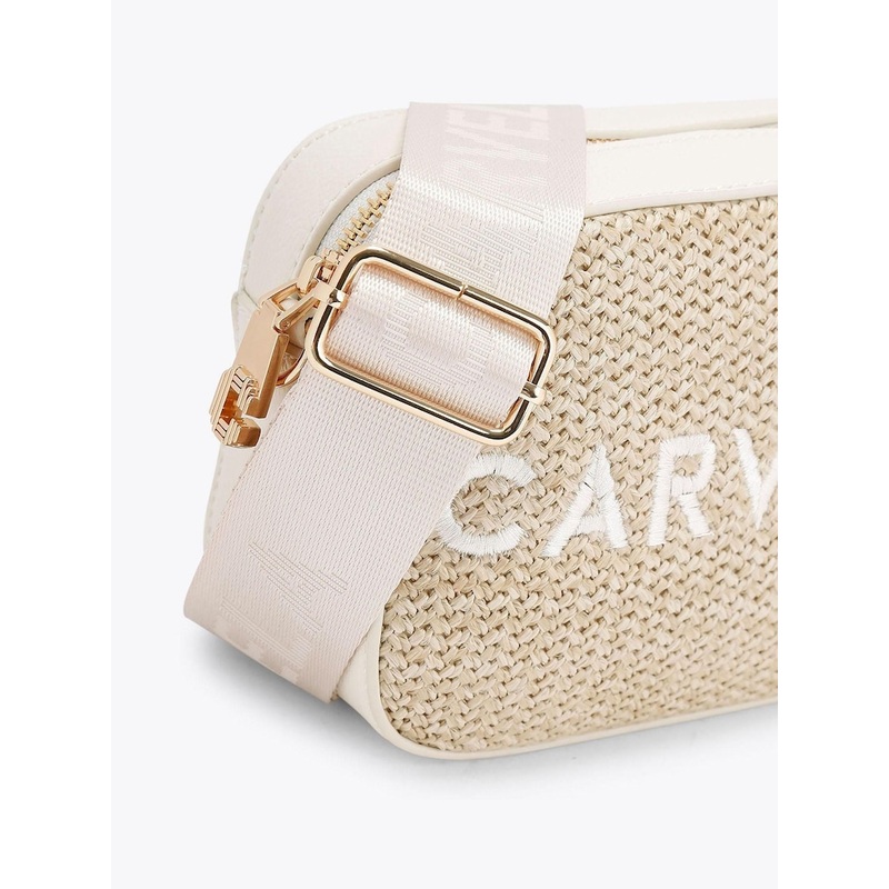 The Carvela Mini Frame Cross Body bag features a bone-textured exterior with embossed branding on the front. The bag is fastened with gone tone Icon C zipper. There are two straps for optional styling. Dimensions: 12cm (H), 17cm (W), 6.5cm (D). Strap lengt