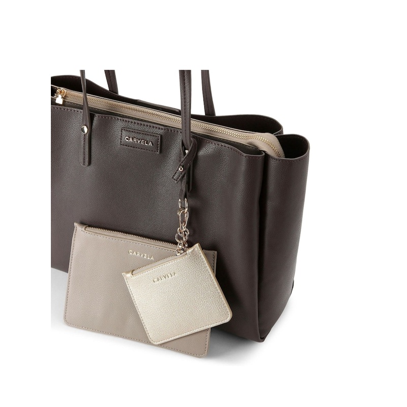 The Carvela Freya Triple Compartment Tote features a black exterior with gold-tone branding There are two, removable zipped pouches on the front Dimensions: 26cm (H), 37cm (L), 10cm (D) Strap length shoulder: 51cm Strap drop: 23cm Height 37cm Width 26cm De