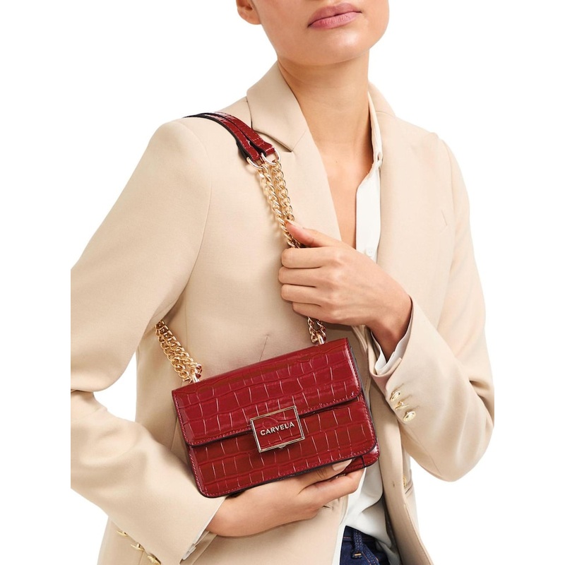 The Carvela Jessica Mini Tote features a red croc embossed exterior with top grab handle for versatile wear. There is a gold-trimmed branded plate on the front. Dimensions: 17cm (H), 21cm (L), 8cm (D). Strap drop cross-body: 97cm. Height 36cm Width 26cm De