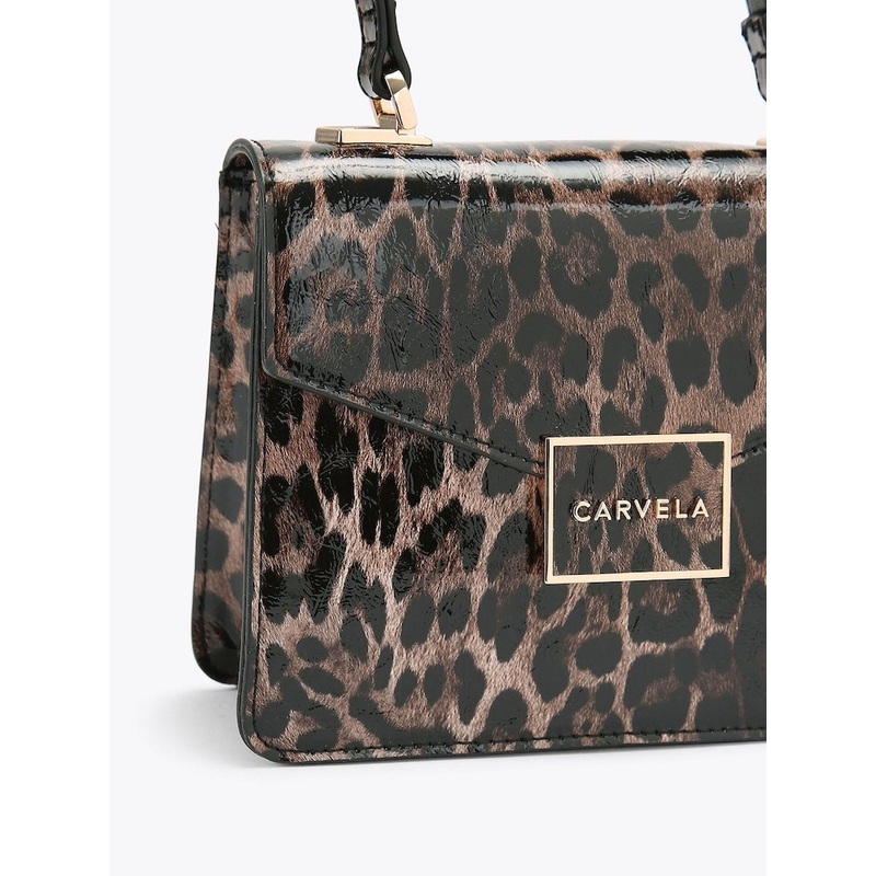 This Jessica Top Handle Bag features a leopard print patent exterior. There is a gold branded plate on the front flap. 100% Polyester.