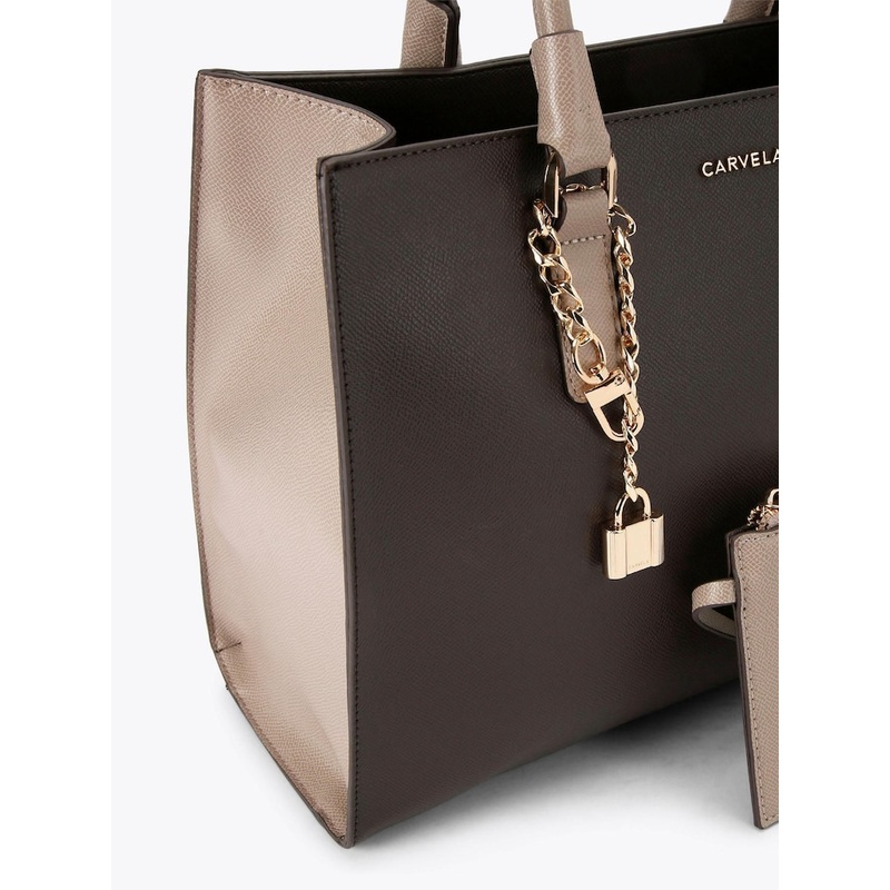 The Latte bag arrives in taupe with gold-tone trims and branding on the front. There is a statement padlock chain on the front handle. Dimensions: 28cm (H), 35cm (L), 10.5cm (D) Strap drop cross-body: 132cm Top handle drop: 36cm 100% Synthetic rubber.