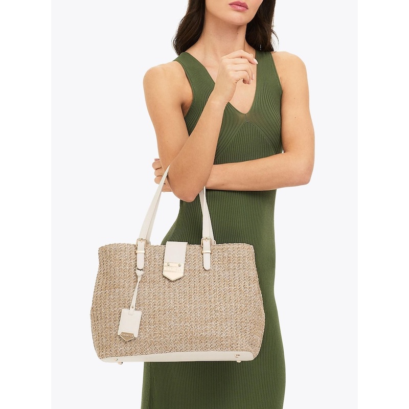 The Midi Maria bag is a natural woven raffia style tote bag. There is a branded luggage tag on the front with gold gold-toned branded plate. 27cm (H), 37cm (L) , 16.5cm (D). Strap length: 118cm Strap drop: 47cm Flap over magnetic closure Interior central z