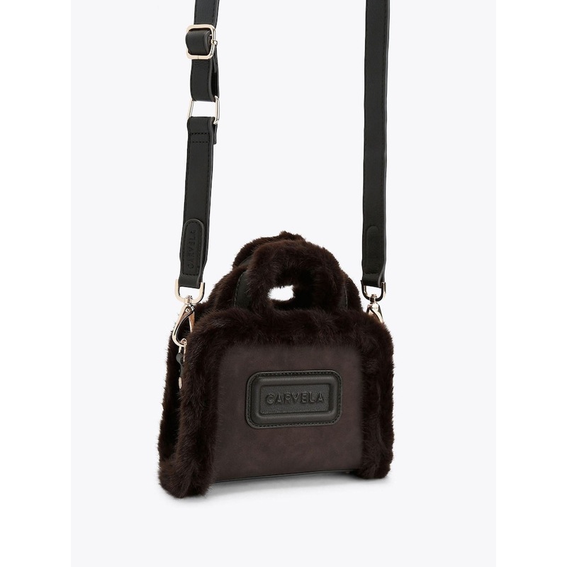 This Carvela Micro Bella Borg Tote Brown Bag features a dark brown microsuede fabric exterior with beige brown faux Borg trim. There is embossed rectangle branding on the front. Dimension: 15cm (H), 19cm (L), 7cm (D) Strap length: 123cm 100% Polyester.