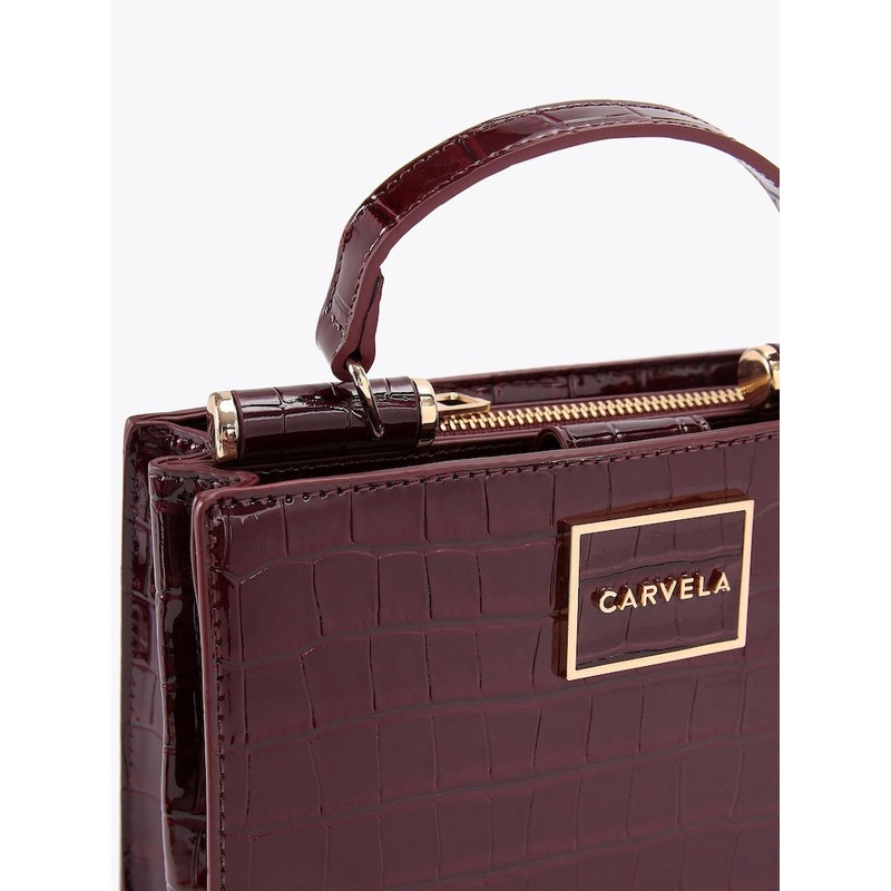 The Carvela Jessica Mini Tote features a dark red croc embossed exterior with top grab handle for versatile wear. 100% Polyester.