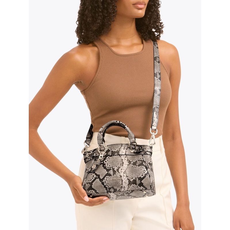 This Carvela Mini Valentina Tote bag features a black croc embossed leather alternative exterior. There are two buckled straps across each side of the bag and branded gold tone hardware across the bag.. 100% Polyurethane.