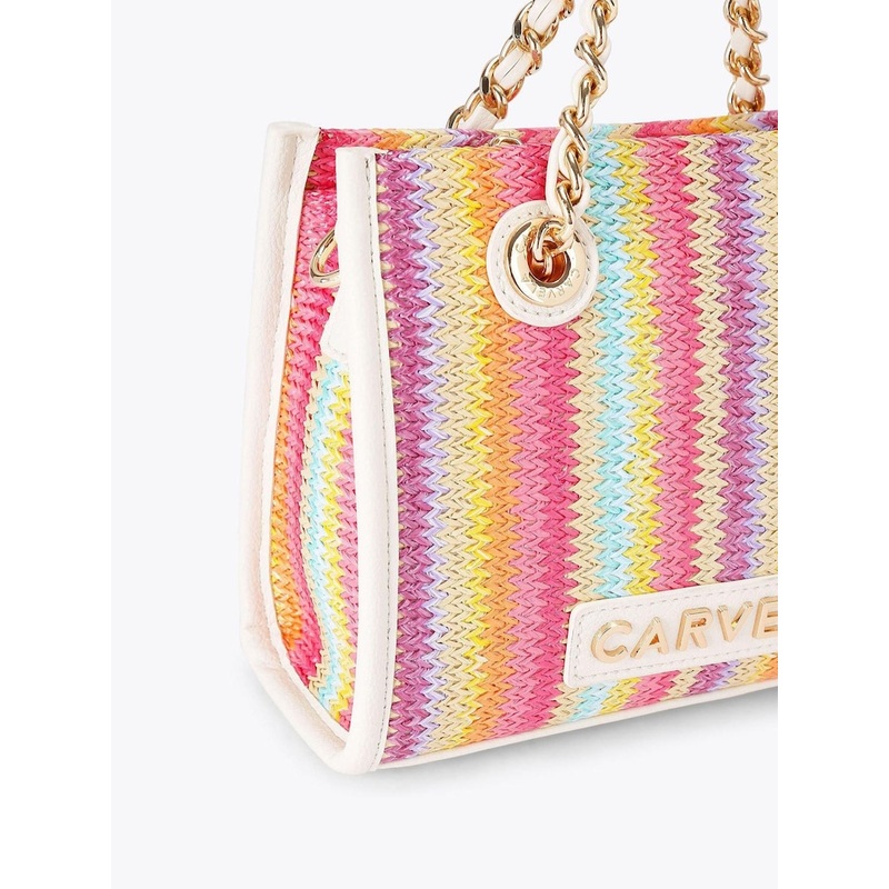 This Carvela Mini Leila Raffia Tote bag Is crafted from a rainbow striped woven raffia. There are two smaller gold chain straps on top of the bag and an optional cross body strap. Dimensions: 17cm (H), 20cm (L), 9cm (D). Strap length: 127cm. 100% Polyester