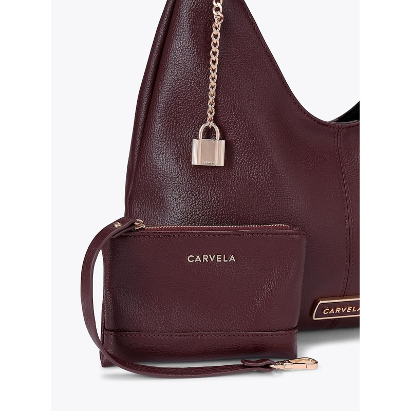 This Mini Cassia Hobo bag features a textured dark red leather alternative exterior. There are gold branding details across the upper as well as a padlock chain on the shoulder strap. 100% Synthetic rubber.