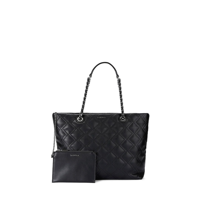 This Rosa Chain Tote Bag features a taupe leather alternative exterior with diamond quilting detail. There are two shoulder straps which have gold chain detail to match the branding on the front of the bag. Dimensions: 29cm (H), 34cm (L), 12cm (D). Strap length: 57cm. Pouch size: 12cm (H), 17cm (L). 100% Synthetic rubber.