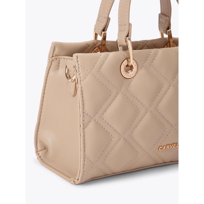 This Rosa East West bag arrives in a taupe leather alternative with diamond over stitch quilting. There are gold branding details seen across the exterior of the bag. 100% Synthetic rubber.