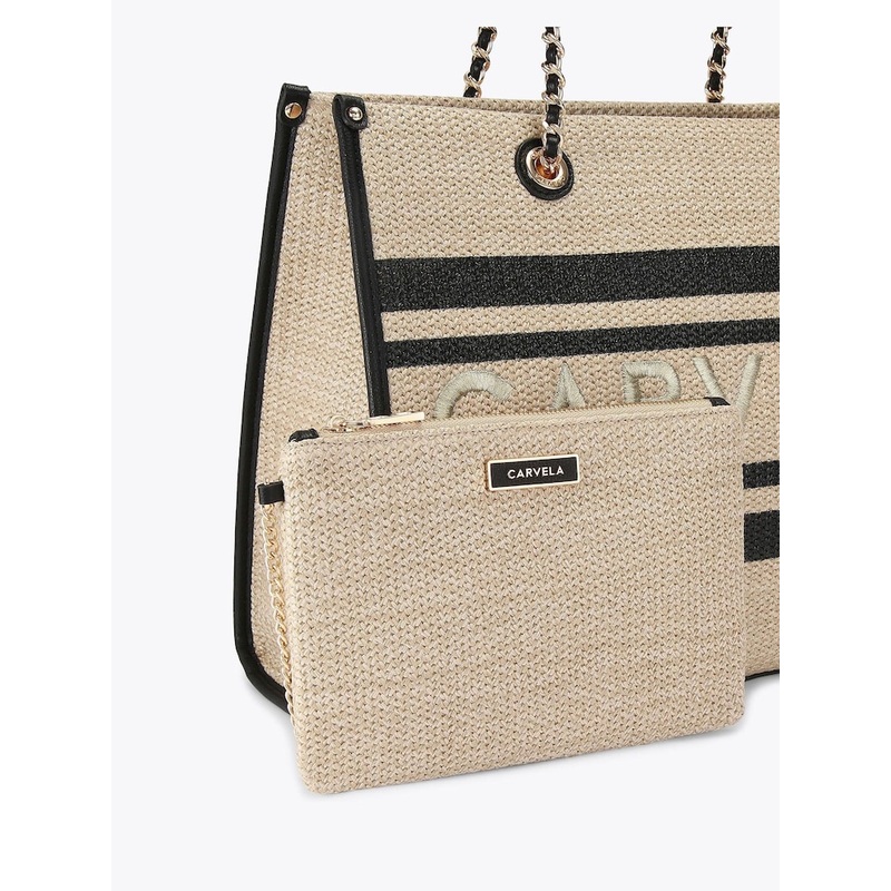 This Sorrento Raffia Tote bag features a woven exterior with stitched Carvela branding on the front. Each shoulder strap is accented with gold chain. There is a removable woven pouch to take from day to night. 33cm (H), 42cm (L), 14cm(D). 100% Polyester.