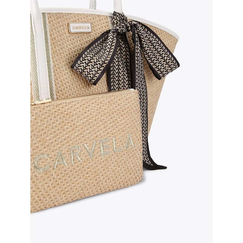 This Sorrento Straw Basket Bag is crafted from a natural woven straw. The trims are in black with a satin scarf around the top handles. There is a woven zipped pouch on the interior and a drawstring interior lining. 32cm (H), 30cm (L), 15cm (D). 100% Polye