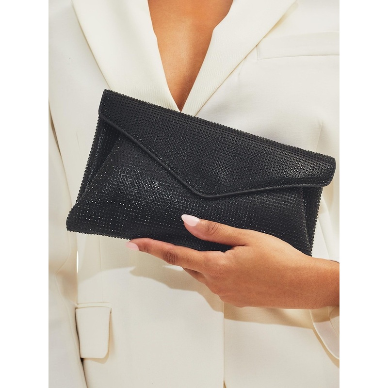 The Carvela Stargaze Envelope Black Clutch bag features a black exterior with crystal embellishment across the exterior. There is black metal branding on the back Strap length: 109cm Strap drop: 50cm Dimensions: 14cm (H), 23cm (L), 2cm (D). 100% Synthetic