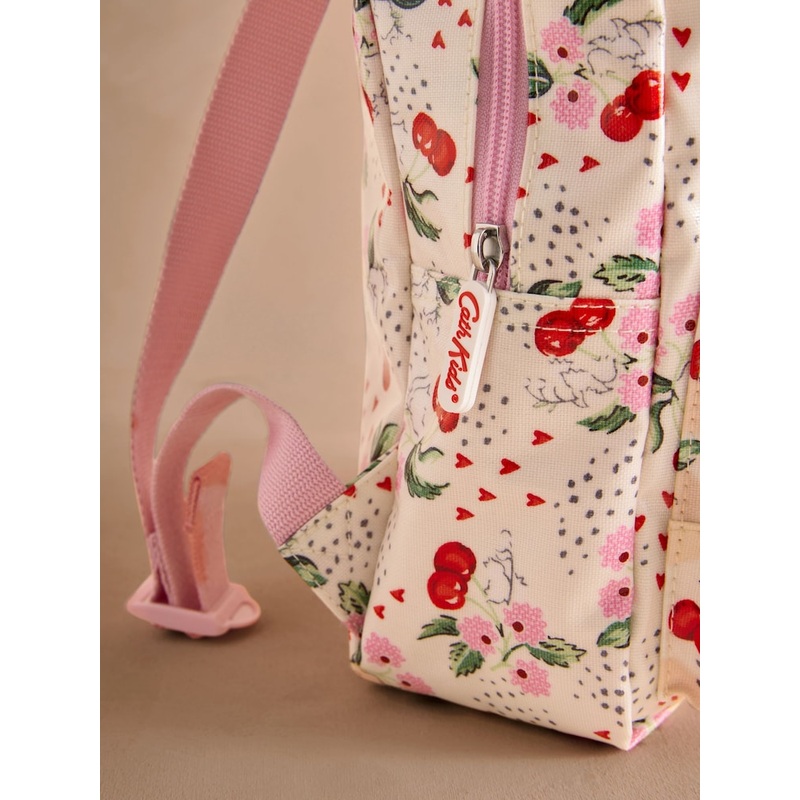 In a light and fresh version of the Cherry Print, this Ecru Cherry Medium Backpack by Cath Kidston is accentuated by pretty dots, white buds and love hearts. Perfectly placed on our shiny coated cotton fabric with internal back wall elasticated slip pocket, webbing grab handle, adjustable webbing straps and customisable ‘Belongs to’ label to the reverse. The perfect addition to your little one’s wardrobe. Height 30cm Width 25cm Depth 8cm Shell 100% Cotton with PVC coating. Lining 100% Polyester.