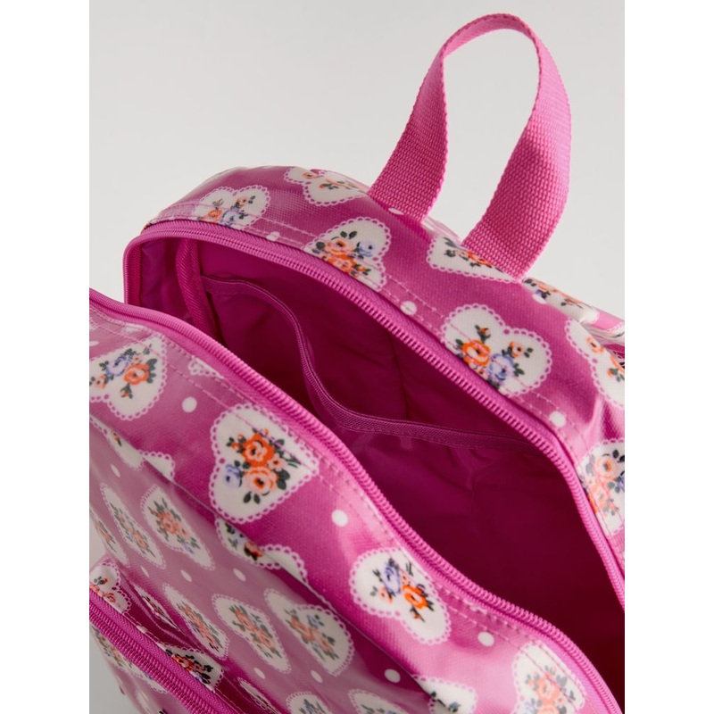 Celebrate all things love with our Lace Heart Classic Backpack by Cath Kidston. Crafted from shiny coated cotton, it features a front zip pocket, grab handle, zipped main compartment, elasticated mesh side pockets (perfect for water bottles) and adjustable padded straps. Smiles guaranteed. 100% PVC coated cotton Adjustable webbing straps Grab handle Mesh side pockets Zip fastening Height 33.5cm Width 27cm Depth 10cm Shell 100% Cotton with PVC coating. Lining 100% Polyester.