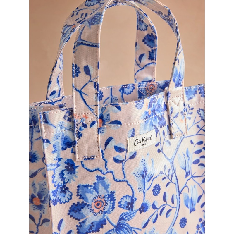 A mini version of our much-loved original, our Small Bookbag hosts all the same features but in a smaller and convenient size. A signature silhouette in our range, our Small Bookbag features a wipe-clean exterior thanks to the PVC-coated shiny cotton making it hassle-free to care for. The plastic base helps to retain the shape and structure of the bag, and the two grab handles make it comfortable to carry around wherever you go. 100% cotton with PVC coating Grab handle straps Wipe clean exterior Cath Kidston branding Height 20cm Width 22cm Depth 8.5cm 95% Cotton, 5% PVC.