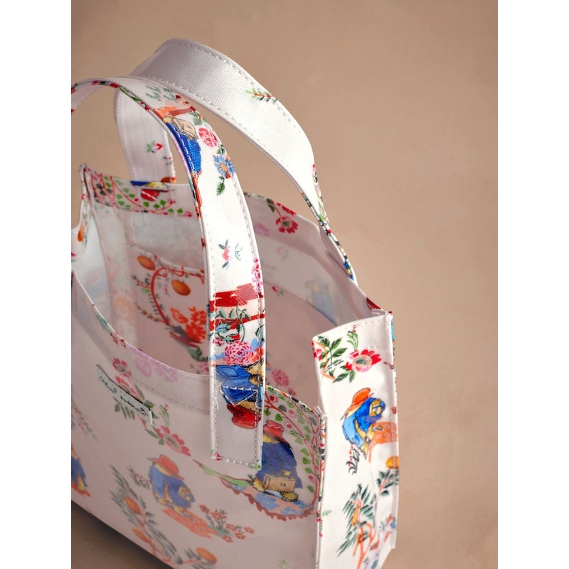 A mini version of our much-loved original, our Small Bookbag hosts all the same features but in a smaller and convenient size. A signature silhouette in our range, our Small Bookbag features a wipe-clean exterior thanks to the PVC-coated shiny cotton making it hassle-free to care for. The plastic base helps to retain the shape and structure of the bag, and the two grab handles make it comfortable to carry around wherever you go. 100% cotton with PVC coating Grab handle straps Wipe clean exterior Cath Kidston branding Height 20cm Width 22cm Depth 8.5cm 95% Cotton, 5% PVC.