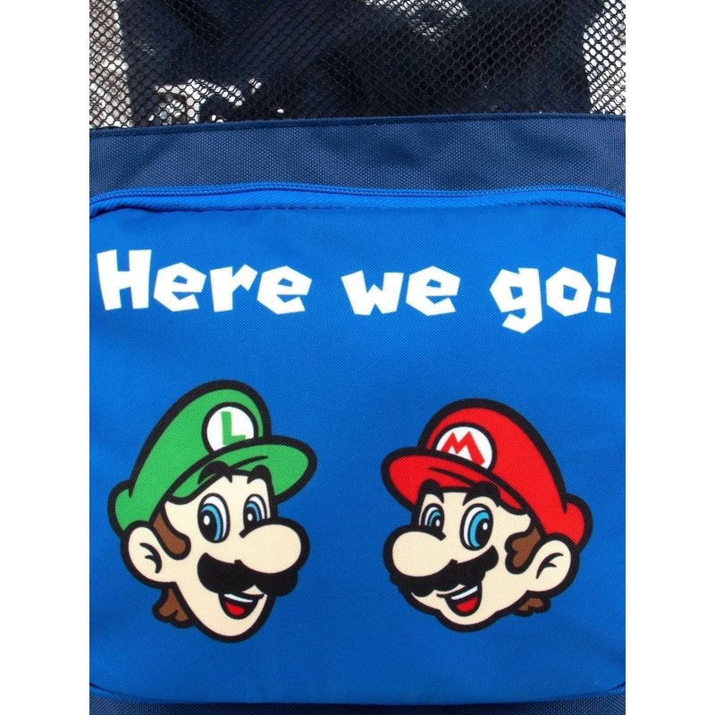 Featuring Luigi and Mario's faces with the words ''Here We Go!'' on a dark blue background, this swimming bag embodies the classic Super Mario Games. This officially licensed Mario Boys backpack comes in Mario's signature colours, with a dark blue body and