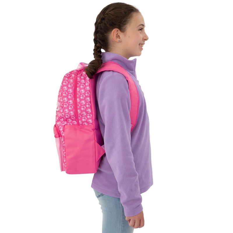 This adorable pink Barbie back pack is perfect for any young fan, featuring the iconic Barbie logo and profile pattern. It includes a handy side mesh pocket for a water bottle, and an extra front compartment with Barbies profile logo sewn on the bottom cor