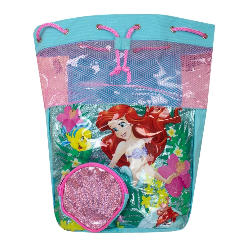 Your little mermaid is sure to feel part of Ariels world with this Little Mermaid-inspired swim sack! A turquoise and pink backpack featuring a pretty design of The Little Mermaid Ariel with best friends Sebastian and Flounder. Complete with a shell-office