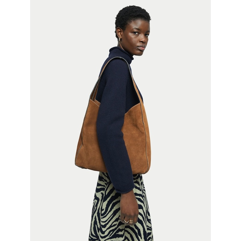 A soft slouch bag made from suede leather with a full cotton fabric lining. This roomy style has a magnet closure, internal zipped back pocket and flat front facing pocket for easy access. Metal feet on the base to prevent the suede from getting dirty. Height 33.5cm Width 35cm Depth 15cm 100% Leather.