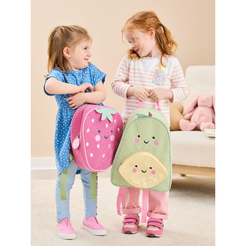 Hop and skip into strawberry sweetness with this Strawberry Character Backpack. When packing for nursery (and trips to the fruit-picking patch!), the adjustable straps are not only comfy and sweet, but they also encourage your little ones to take responsibility for their belongings. This backpack is just the right size for lunchtime-munching and snacktime-crunching and storing all the items your little one needs for a day well spent, making it an absolute must-have, whatever they get up to – pip pip hooray. Strawberry character backpack Name tag inside Flower zip Adjustable shoulder straps Hanging loop and carry handle Wipe clean only Suitable from 3 years