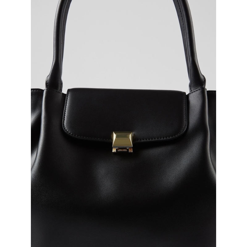 The Otello lock tote in black leather is lined with cotton, making it a stylish and practical day bag. 100% Leather.