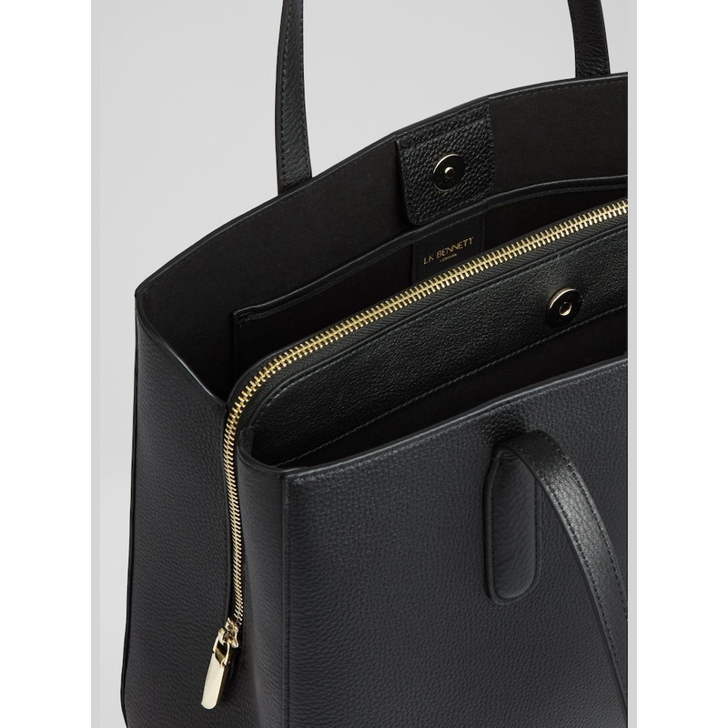 The Olivia tote, designed in rich black grained leather, features new branding and a cotton lining. It exudes elegance for your workday ensemble. Perfect for the office or a dinner date, it pairs effortlessly with tailored suits for a refined appearance. 1
