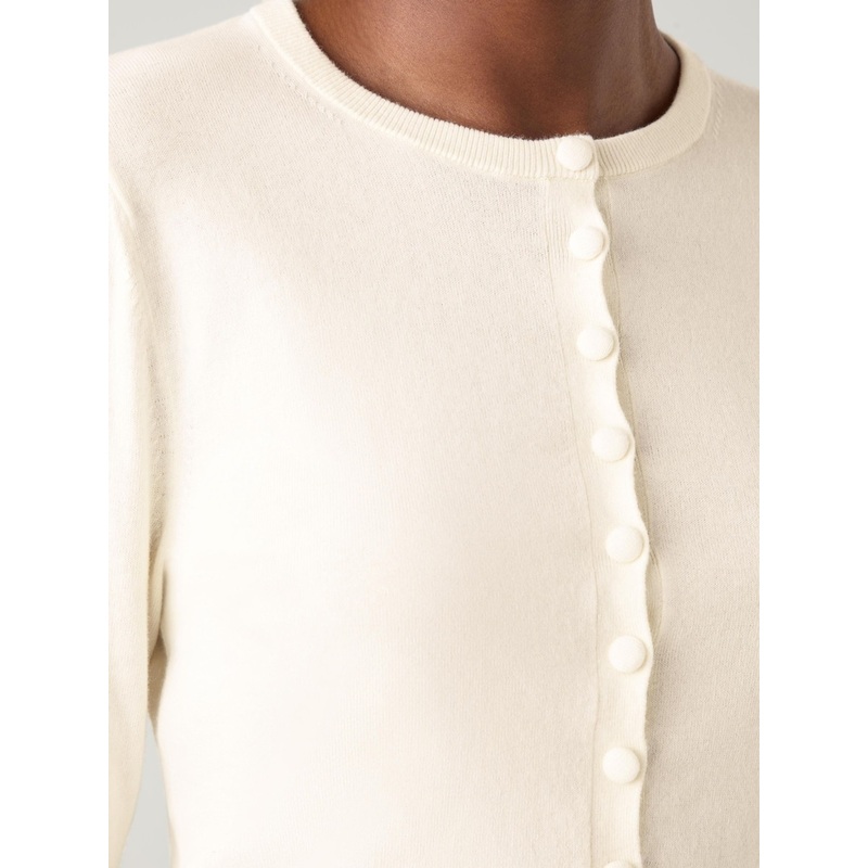 The Lottie cardigan embodies understated elegance with practical refinement. Crafted from mules-free merino wool and cotton in a cream hue, this fine gauge button detail cardigan features ribbed cuff and hem detailing with self-covered buttons for a polished finish. The bracelet sleeve and classic crew neck create a flattering silhouette that transitions effortlessly from office to evening. Layer over a silk camisole or pair with a dress for stylish warmth. 70% Cotton, 30% Merino wool.