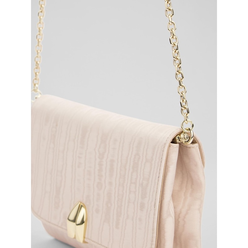 The Arianne curve flap wide clutch bag in vibrant pink, crafted from luxurious moir, features an exquisite print that elevates any outfit. Perfect for those heading to events, seeking elegance in their accessories. 100% Viscose.