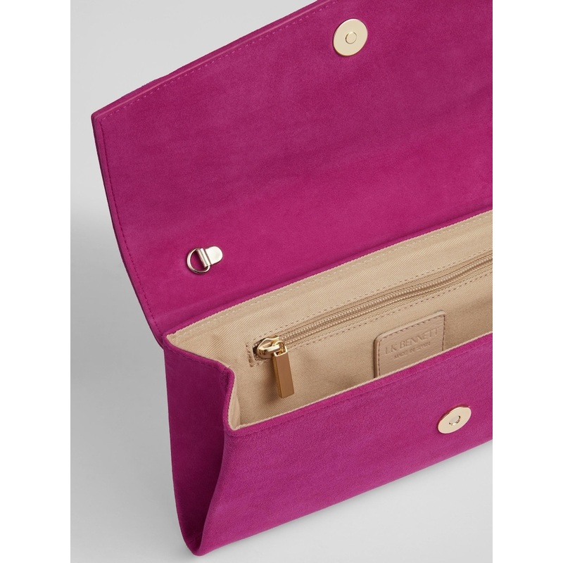 The Layla clutch is crafted in Spain from bright burgundy suede. This roomy, envelope design is lined in suede and fabric, has an inside zip pocket, a detachable suede and chain shoulder strap and is finished with a metal button closure. 100% Leather.