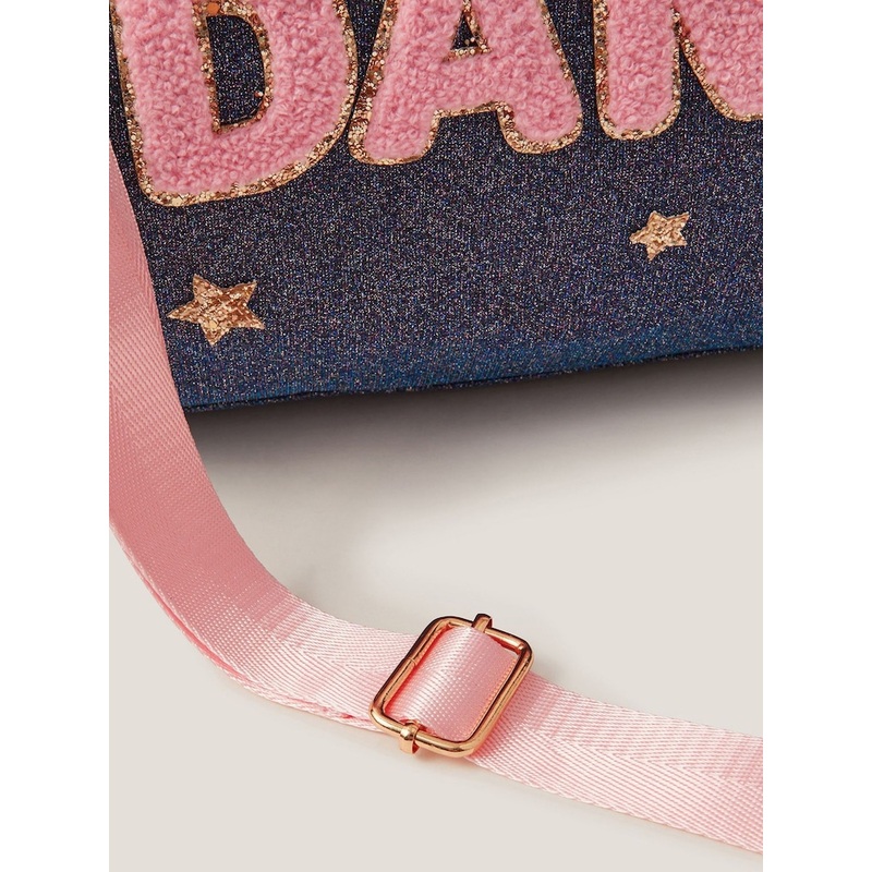 Lights, Camera, Action! Perfect for after-school activities or sleepovers, this duffle bag is designed in a glitzy fabric and decorated with gold stars and a DANCE slogan on the front. Features a zip fastening, two top handles and and a detachable shoulder strap. Height 35cm Width 6cm 85% Polyester, 10% Metal, 5% Plastic.