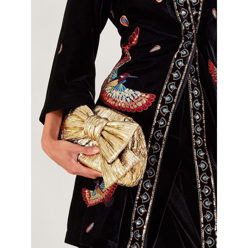 I look great at golden hour. For summer weddings, add a warm glow to your occasion dress with this golden bag. Designed in pleated fabric with a metallic finish, it features an oversized bow to the front with a clip frame profile. Tuck the chain strap insi