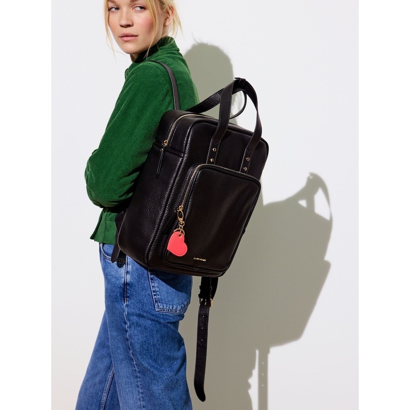 Black backpack designed to fit a laptop, with two exterior zipped pockets, short carry handles and a pink heart charm. Height 38cm Width 28cm Depth 12cm Main 100% Polyurethane. Lining 100% Polyester.