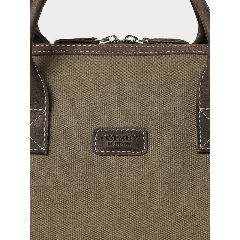 The Hunter Barrel Bag is the perfect companion for your journeys, whether urban or in nature. Constructed with a sturdy canvas body and accented by leather trims, this bag blends rugged charm with modern style. Handcrafted in khaki canvas with brown leather details, it features rolled chocolate leather top handles with ecru contrast cotton cross-stitching. The front bears the OSPREY LONDON embossed leather logo patch. The spacious interior is lined with chocolate OSPREY LONDON jacquard fabric and opens fully with a shiny nickel zip and two leather zip pulls. Inside, an additional zipped pocket secures valuables, featuring the OSPREY LONDON winged crest logo framed in matching leather beneath. The bag comes with an adjustable chocolate webbing strap and a leather shoulder pad for comfortable carrying. Height 27cm Width 50cm Depth 30cm 50% Leather, 50% Leather* *Contains non-textile parts of animal origin.