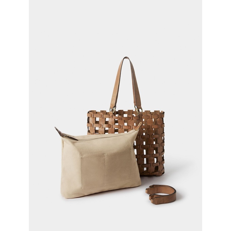 The Ophelia Cage Tote makes a bold statement with its striking large open weave design. Offering versatile functionality, it features detachable grab handles that can be swapped with shoulder straps that come neatly presented in a canvas storage pouch. This tote perfectly blends style and practicality and is a timeless addition to your wardrobe. Comes with a dust bag. Height 33cm Width 38cm Depth 7cm 100% Leather.