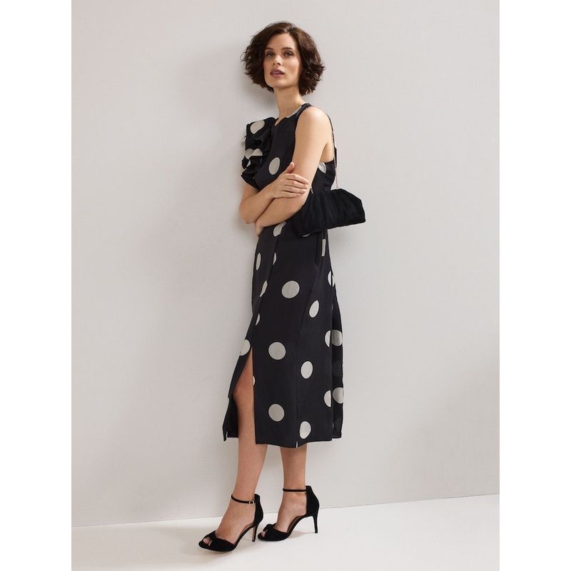 Our black suede clutch bag features delicate pleating, gold metal detailing and a handy chain for versatile use, ideal as a sophisticated event accessory. Style with our matching suede heels for a coordinated look. Model Wears: UK10, 5 9" 100% Suede.
