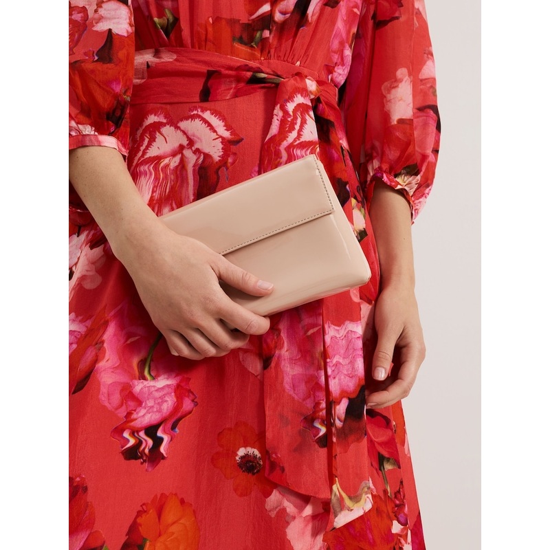 Carry your essentials in style with our nude patent clutch. Fastening with a hidden magnetic clasp our bag pairs perfectly with our matching kitten heels for a sophisticated event look. Height 14cm Width 4cm 100% Polyester.